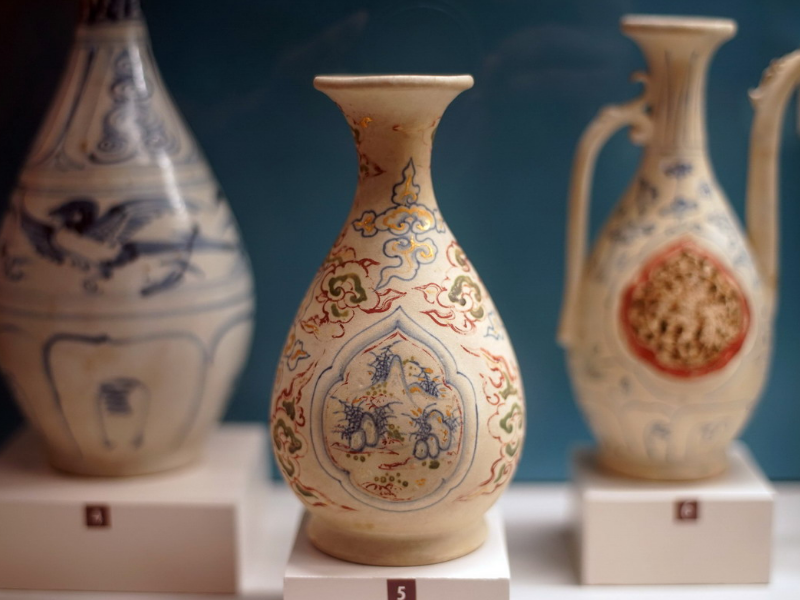 Men trắng chàm là sự kết hợp hài hòa giữa nền men trắng trong và hoa văn vẽ màu xanh cobalt, tạo nên vẻ đẹp thanh nhã, trang trọng. Men tam thái lại gây ấn tượng bởi sự phối hợp tinh tế của ba gam màu: vàng, đỏ nâu và xanh lục, thể hiện trình độ kỹ thuật vượt trội của thợ gốm Chu Đậu xưa. Những lớp men này không chỉ có độ bền cao mà còn giữ được màu sắc tươi sáng qua hàng trăm năm, khẳng định giá trị nghệ thuật và lịch sử đặc biệt của gốm Chu Đậu.