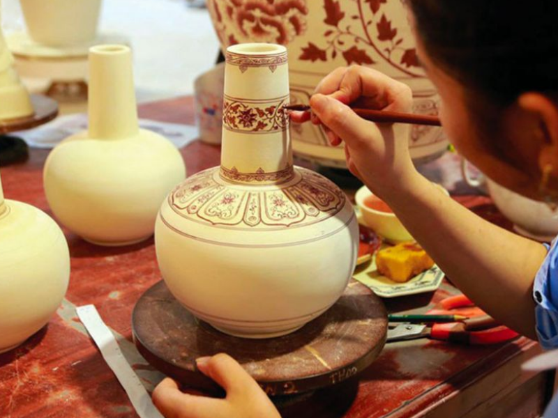 Điểm đặc sắc của gốm Chu Đậu nằm ở kỹ thuật vẽ dưới men. Hoa văn được vẽ trực tiếp lên xương gốm trước khi phủ men và đưa vào lò nung. Nhờ vậy, họa tiết không bị phai mờ mà hòa quyện vào lớp men, tạo nên chiều sâu và độ bền hiếm có. Chính sự kết hợp giữa kỹ thuật điêu luyện và cảm hứng dân gian đã giúp gốm Chu Đậu giữ được bản sắc riêng, không trộn lẫn với bất kỳ dòng gốm nào khác.